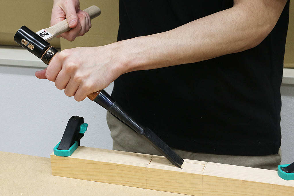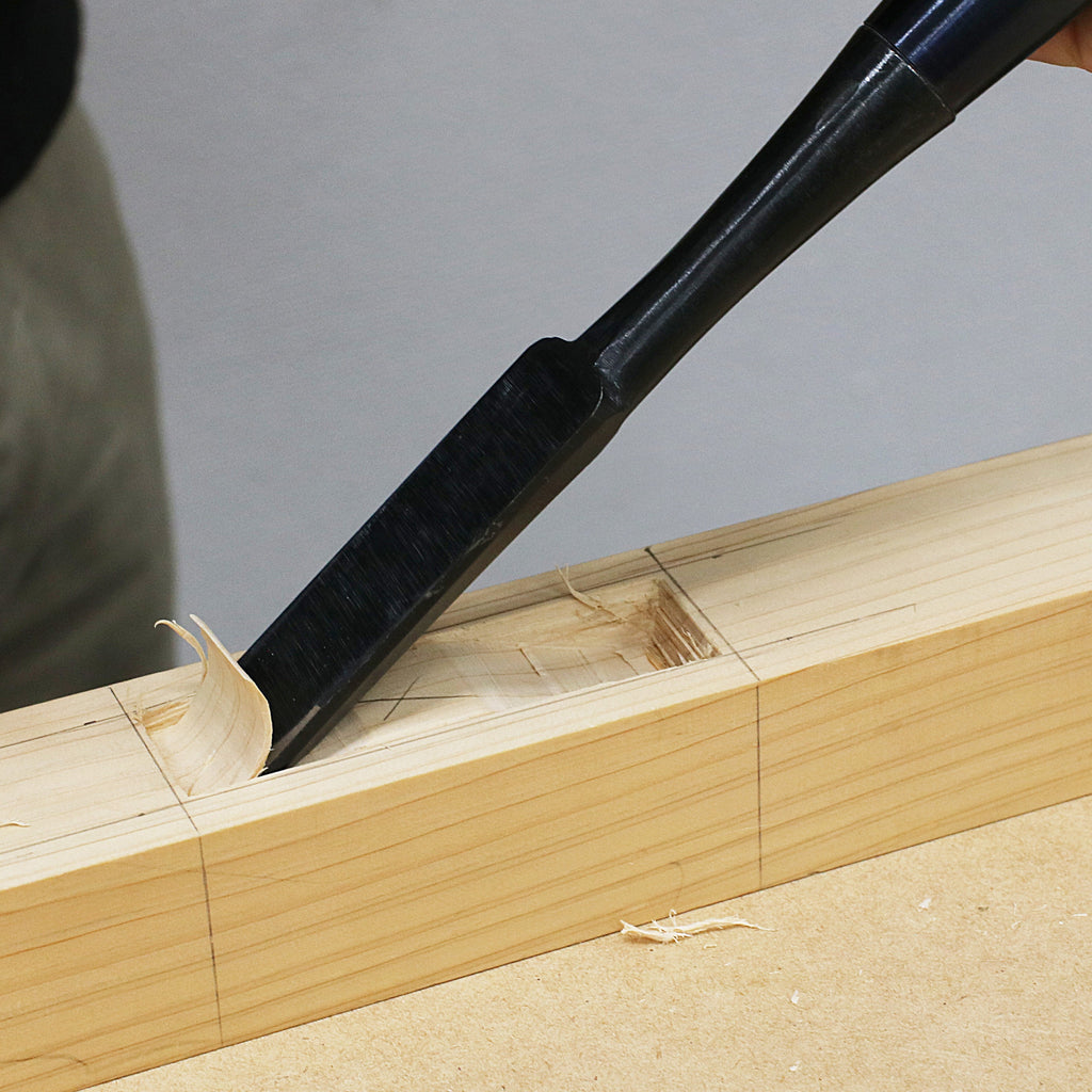 Compared to chisels used for joinery work (Oire Nomi chisels), it has a thicker blade and a larger, sturdier overall build.