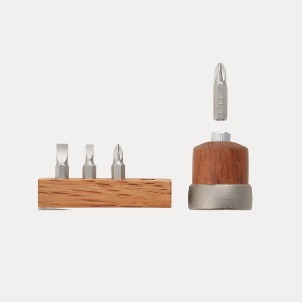 (10) Screwdriver Set with Handle and Bit Stand Material: Red Oak, Alloy Steel Nickel Plated Size: L35×w35×H40mm ((-)6mm, 4mm, (+)#1, #2) |