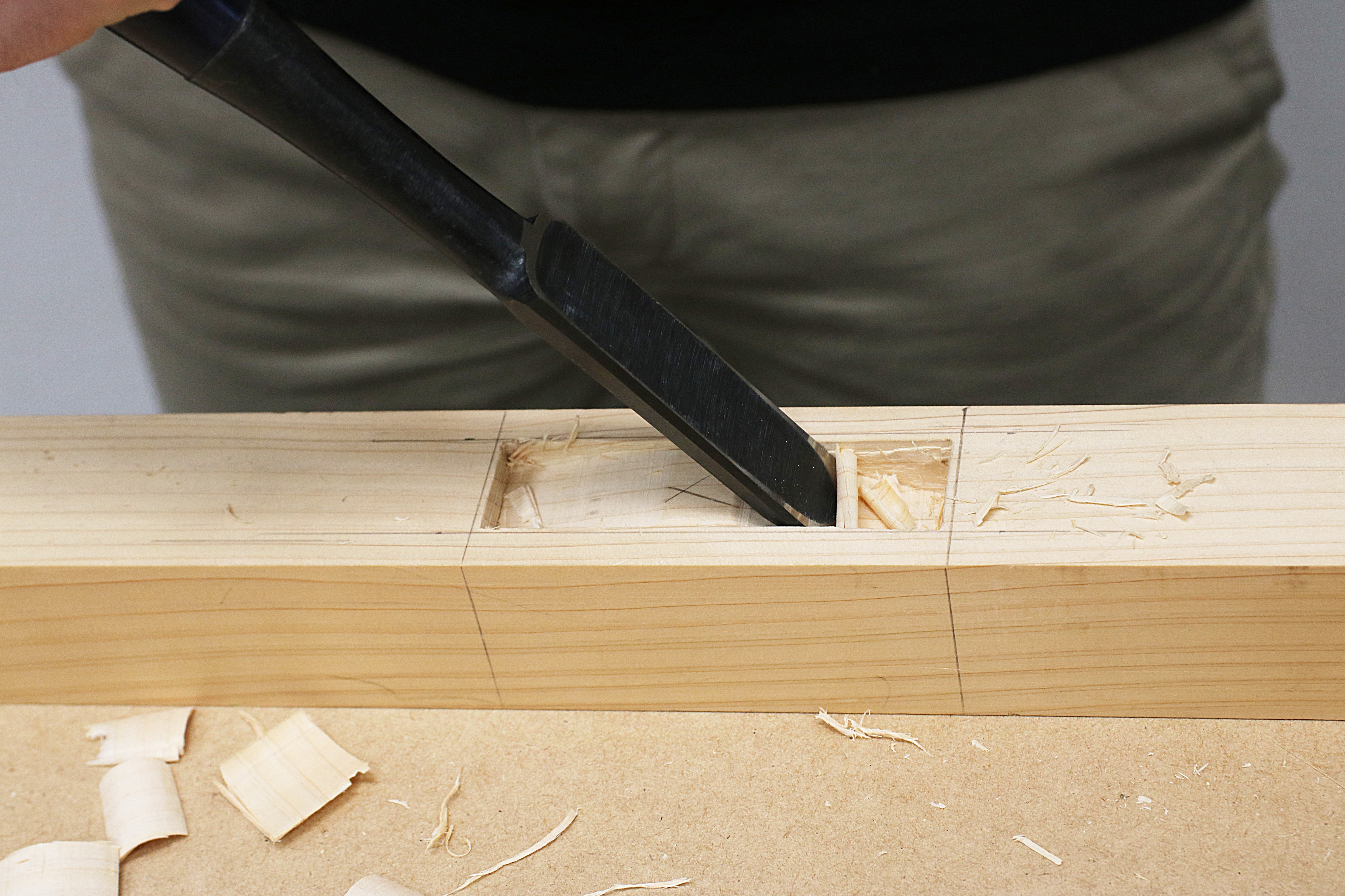 Compared to chisels used for joinery work (Oire Nomi chisels), it has a thicker blade and a larger, sturdier overall build.